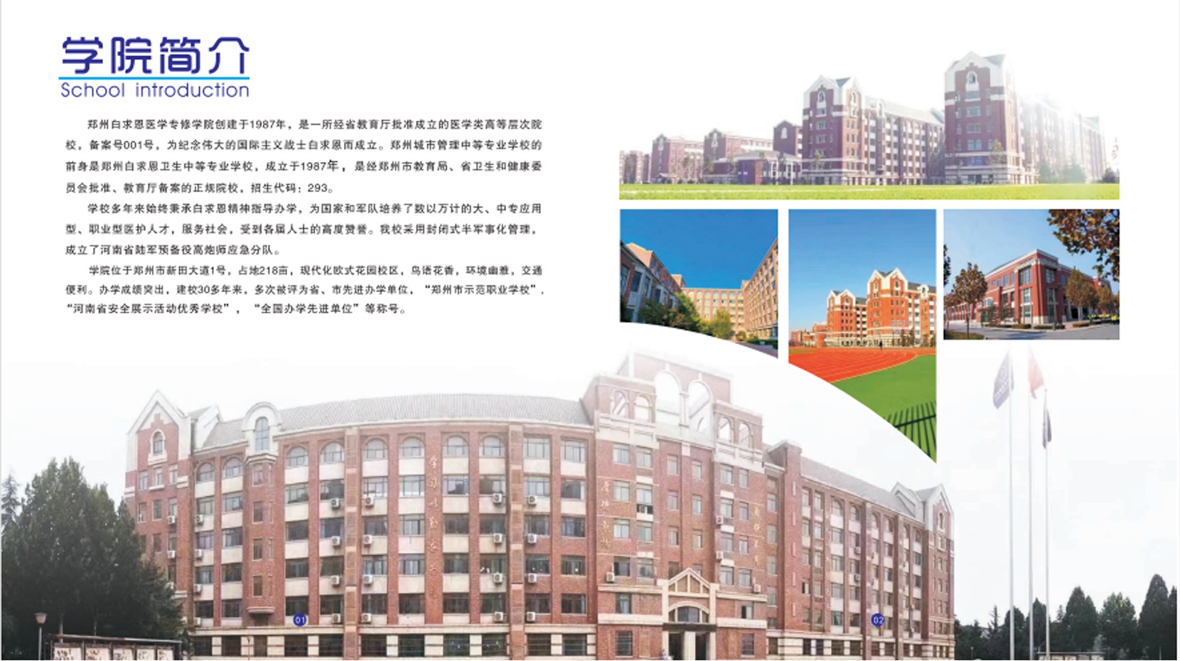 郑州白求恩医学专修学院创建于1987年,为纪念伟大的国际主义战士白求恩而创建,是一所经省教育厅批准成立的医学类高等层次院校,备案号001号。郑州城市管理中等专业学校是经郑州市教育局、省卫生和计划生育委员会批准,教育厅备案的河南省唯一一所“城市管理”类院校,招生代码:293。郑州白求恩医学院